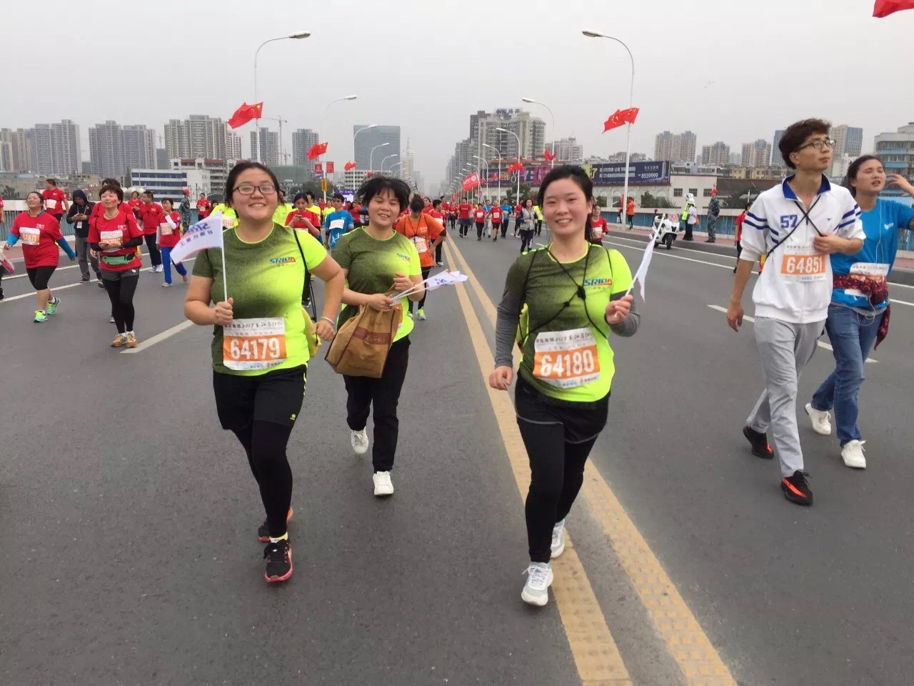 时瑞达员工代表共56人参加了此次的“襄马”活动。其中参加全程马拉松(42.195KM)一名,半程马拉松(21.0975KM)四名,健康跑(7KM)49名,后勤人员2名。从报名到比赛参赛员工在经历了一个多月的等待,终于迎来了此次盛会,参赛员工兴奋地奔跑在美丽的赛道上,飘扬的公司司旗像一艘小船流淌在欢乐的长河中。